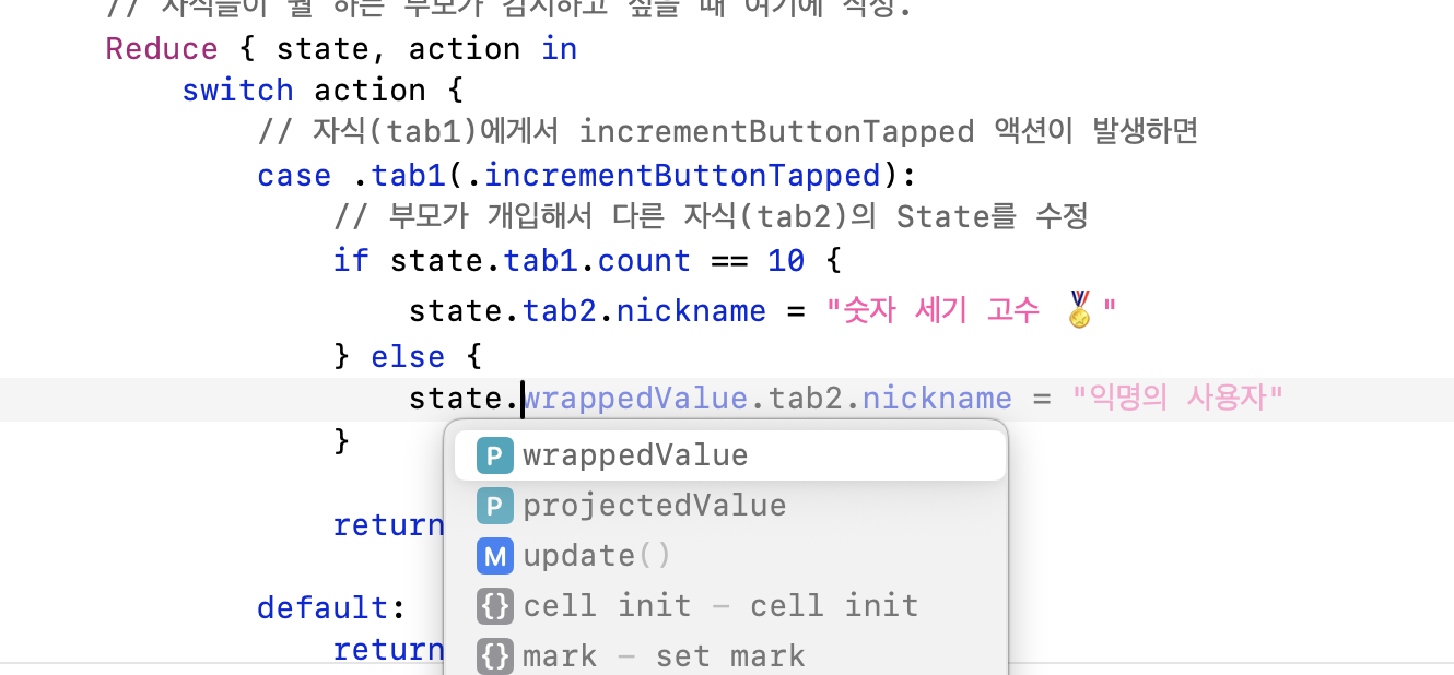 "tab1 액션이 들어오면 -> tab1 State를 가지고 -> CounterFeature 로직을 돌려라"