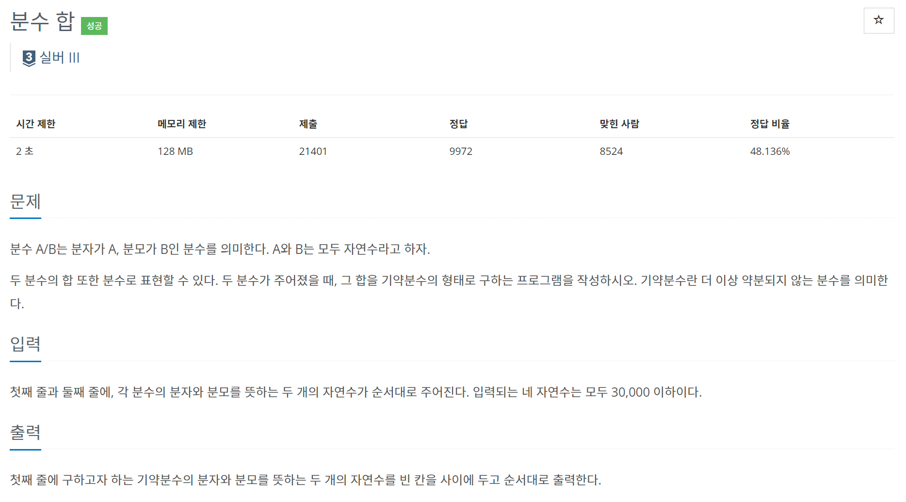 분수 A/B는 분자가 A, 분모가 B인 분수를 의미한다. A와 B는 모두 자연수라고 하자.