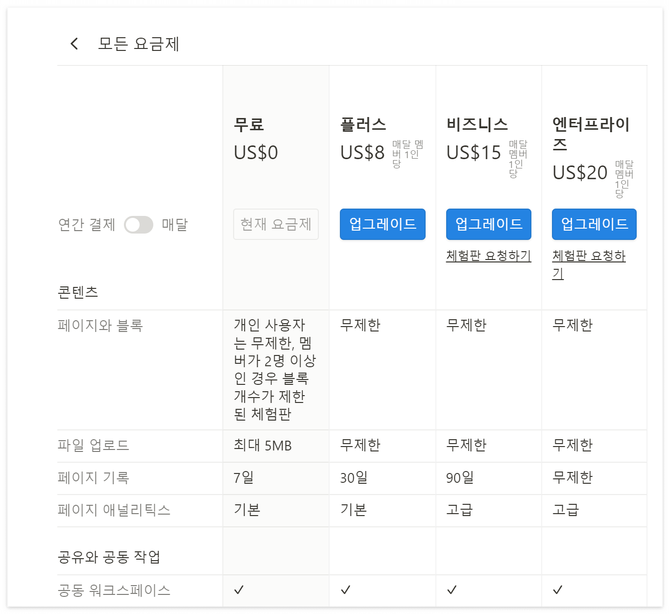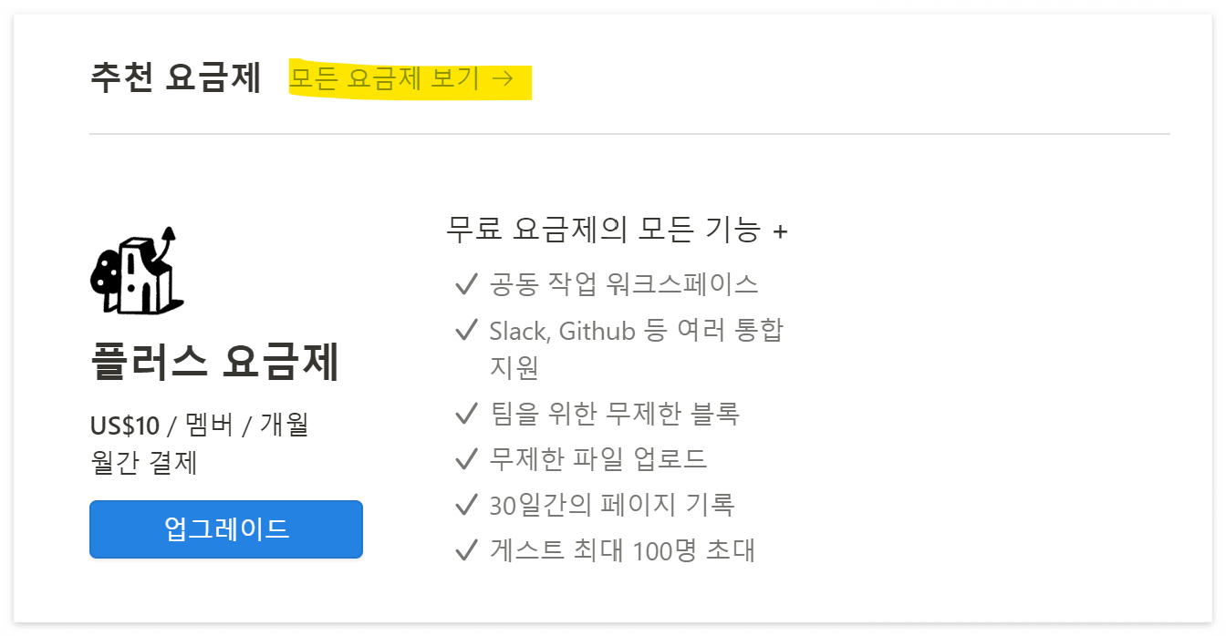 '설정과 멤버'를 클릭 후 나온 화면에서 '워크스페이스'에 있는 '업그레이드'를 클릭한다.